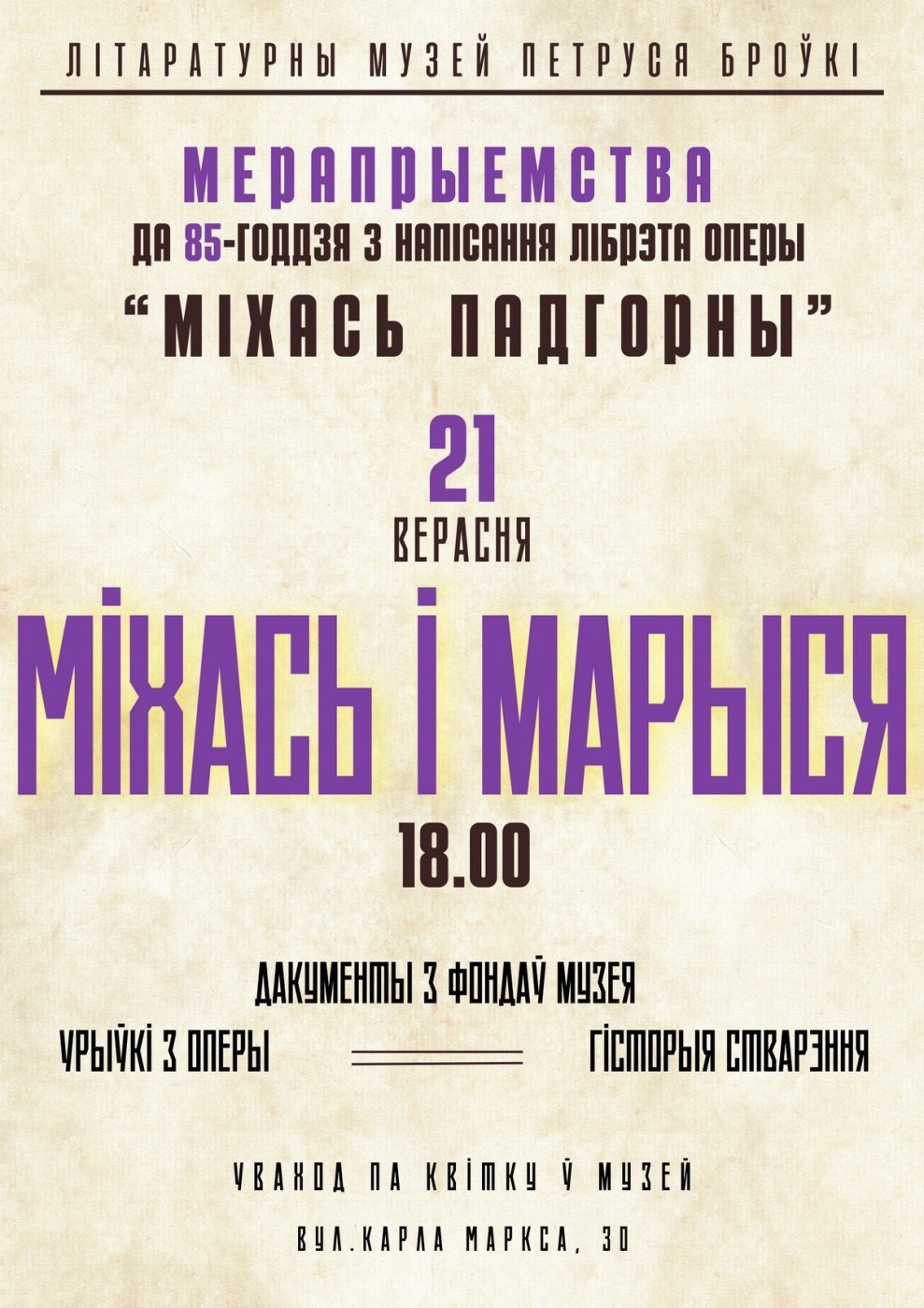 21 верасня а 18-й гадзіне запрашаем вас на мерапрыемства “Міхась і Марыся”, прымеркаванае да 85-годдзя з напісання лібрэта оперы “Міхась Падгорны”.